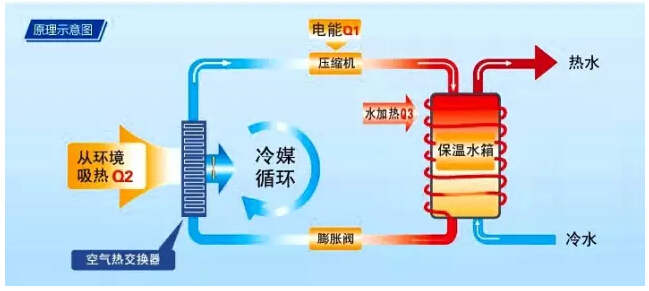 空氣能熱水器的工作原理與空調在冬季制熱相似。熱水器在電能的驅動下,以制冷劑為載體,以少量的電,從空氣中吸收熱量制取熱水,相比于普通熱水器單純的能量轉換,制熱效率更高,并實現了水電分離。安全性能更好。