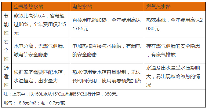 目前大多數家庭對熱水的使用需求都比較大,除了洗澡以外,洗碗、洗菜都需要用到熱水,尤其是冬天。為此熱水使用費用是選購熱水器重要的考慮因素之一。以華源空氣能熱水器為例,從表中可以看出,使用空氣能熱水器全年費用僅315元,這將為家庭節省很大一筆開支。